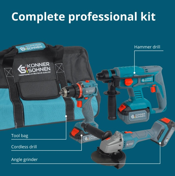 Fjölhæft þráðlaust 3-í-1 sett, 20V með 2x4Ast rafhlöðum