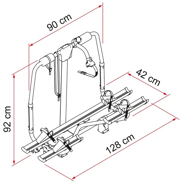 Kemur með festingar fyrir 2 hjól, stækkanleg í 3, engin götun.