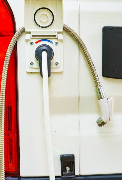 Lok er opnað, tengistykki stungið í og snúið 45-90° eftir því hversu heitt vatnið á að vera og tekið í gikkinn til að fá vatn.