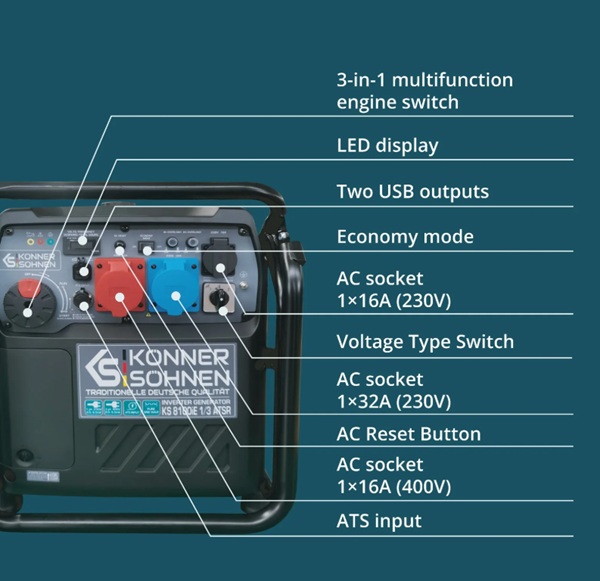 | Outlets | 1xSchuko 230V, 1xCEE 230V 32A, 1xCEE 400V 16A |